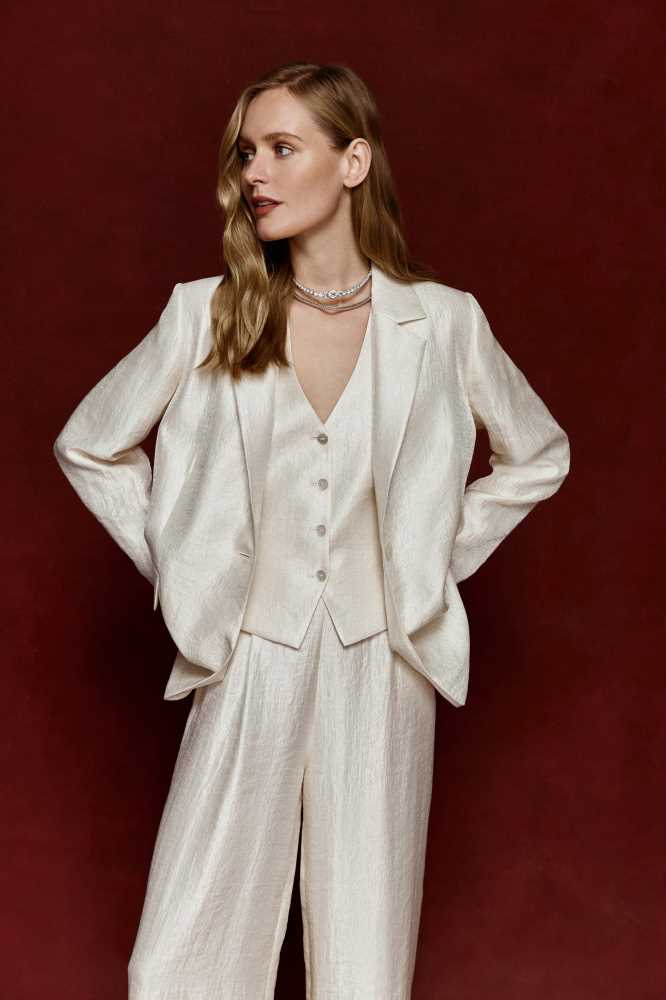 - Металлизированный полиэстер – материал с металлическим блеском, который придает жакету эффект экстравагантности и индивидуальности.